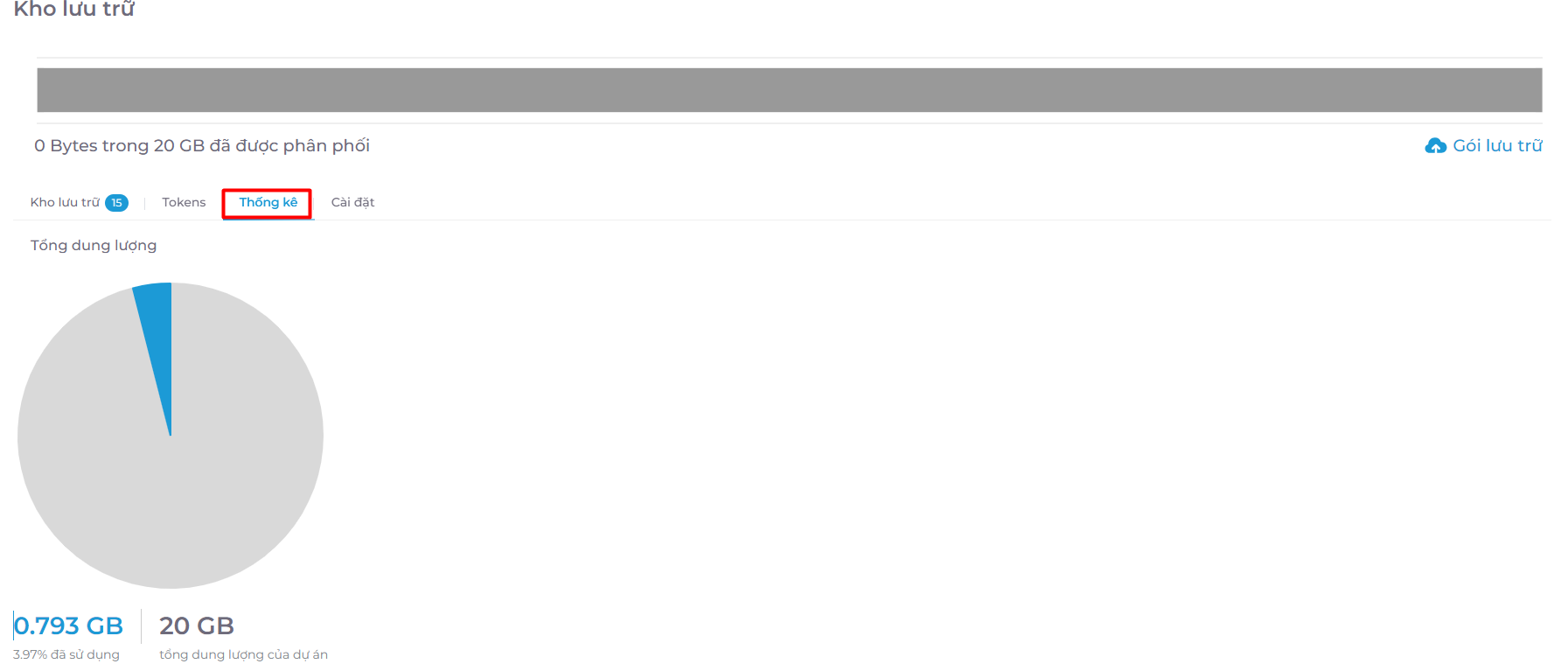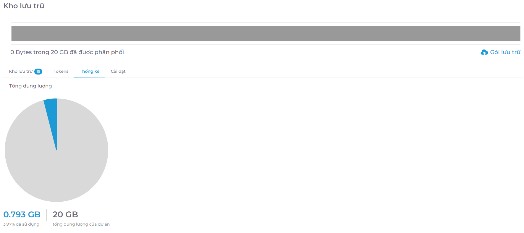 Tại đây sẽ hiển thị tổng dung lượng của mỗi dự án và dữ liệu đã sử dụng.