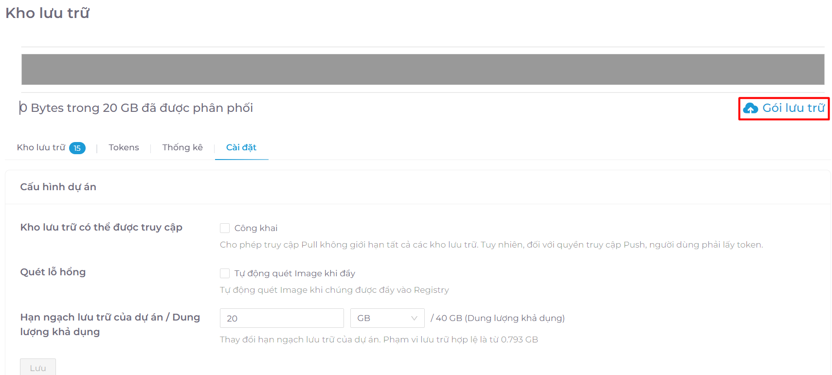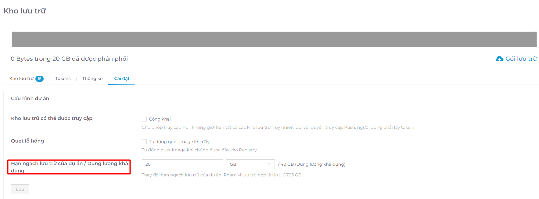 - Tại mục Hạn ngạch lưu trữ của dự án/Dung lượng khả dụng, điền thông tin về dung lượng bạn muốn thay đổi cho dự án, sau đó chọn Lưu.