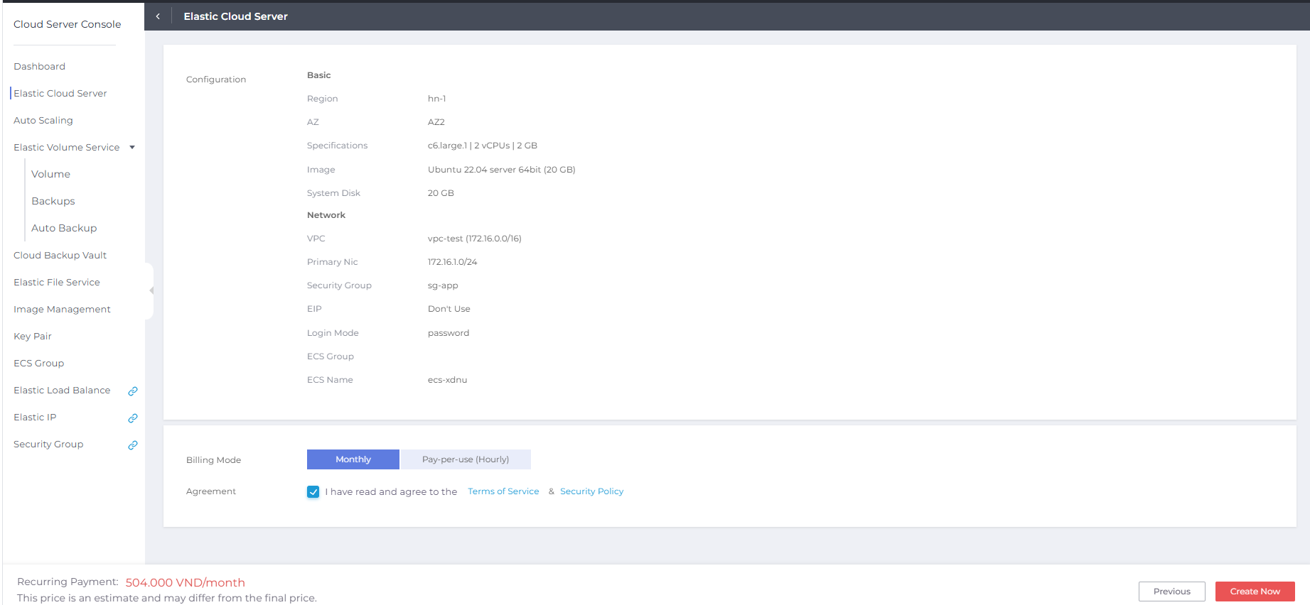 | Vùng sẵn sàng | Chọn vùng sẵn sàng trên các Region với; Hà Nội: AZ1; AZ2; AZ3; AZ4 Hồ Chí Minh: AZ1; AZ2; AZ3 |