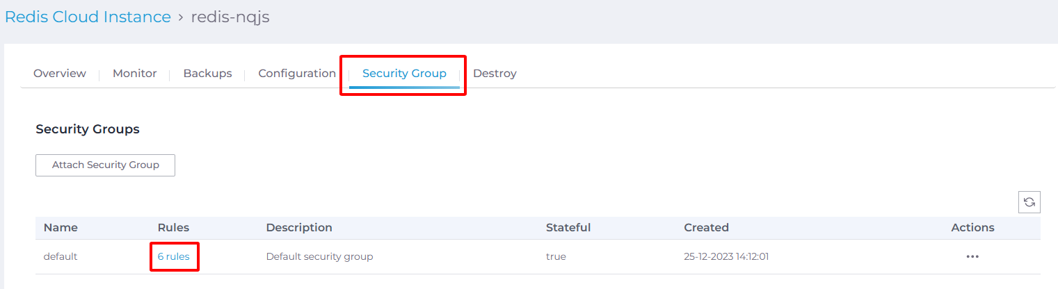 Để chỉnh sửa chính sách thiết lập bảo mật chiều Inbound và chiều Outbound đến Redis Database có thể thiết lập tại mục “Security Group”