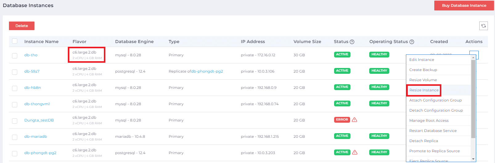 2. Chọn Database Instance người dùng muốn thay đổi cấu hình và chọn biểu tượng dấu … ở cột Actions