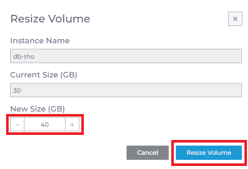 5. Kiểm tra lại thông tin sau đó chọn “Resize Volume” và chờ hệ thống điều chỉnh dung lượng ổ đĩa Database Instance