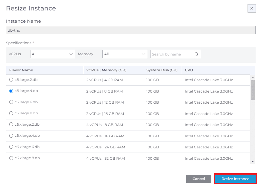 5. Kiểm tra lại thông tin sau đó chọn “Resize Instance” và chờ hệ thống điều chỉnh cấu hình Database Instance