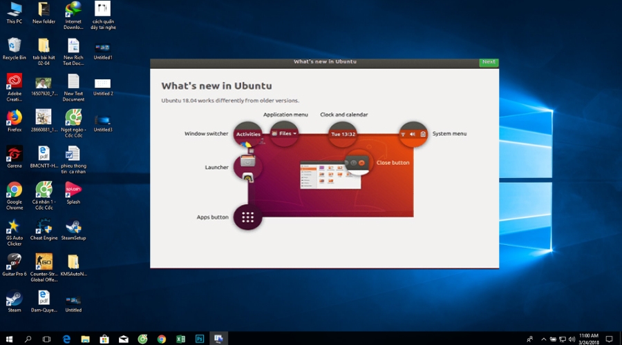 Chờ khoảng 10-20 giây để truy cập vào Ubuntu. Sau khi nhấn vào icon Ubuntu ở màn hình, bạn tiến hàn thiết lập ngôn ngữ và layout bàn phím.