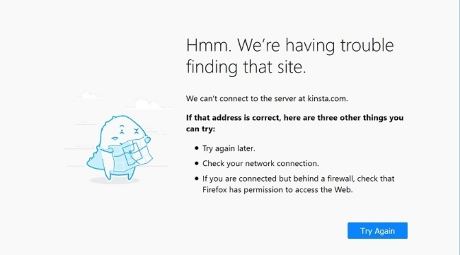 Với trình duyệt Mozilla Firefox, lỗi này chỉ hiện thị dưới dạng Hmm với thông báo “We’re having trouble finding that site ( Chúng tôi gặp khó khăn khi tìm kiếm trang web). Phía dưới là dòng chữ We can’t connect to the server at domain.com ( Chúng tôi kohong thể kết nối với máy chủ tại domain.com).