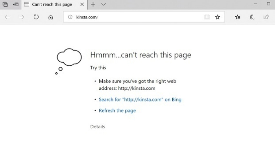 Nếu bạn sử dụng Microsoft Edge, trình duyệt chỉ hiện thị Hmmm… can’t reach this page. Điều này không hữu ích trong việc tìm kiếm nguyên nhân gây lỗi. Bạn có thể thử các giải pháp được gợi ý bên dưới như kiểm tra xem địa chỉ domain.com đã đúng chưa.