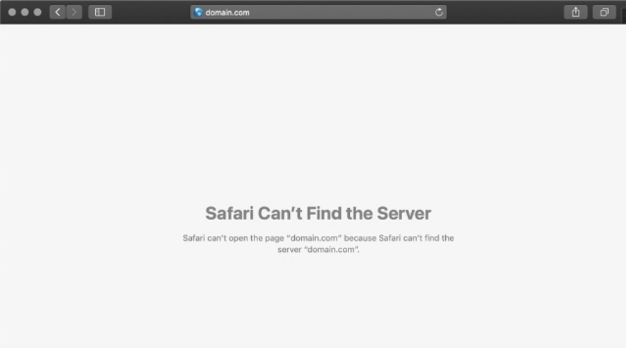 Safari can’t open the page “domain.com” because Safari can’t find the server “domain.com” (Safari không thể mở trang “domain.com” vì Safari không thể tìm thấy máy chủ “domain.com”).