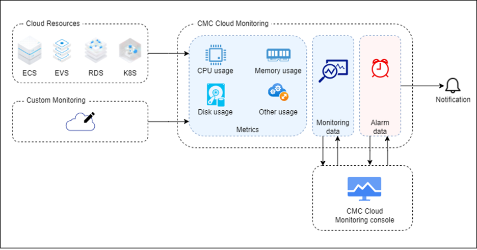 Hệ thống CMC Cloud Monitoring hoạt động như một giải pháp toàn diện giúp giám sát và quản lý hiệu quả các tài nguyên đám mây cũng như các dịch vụ tùy chỉnh, đồng thời cung cấp các cảnh báo và thông báo để đảm bảo sự liên tục và hiệu suất của hệ thống.
